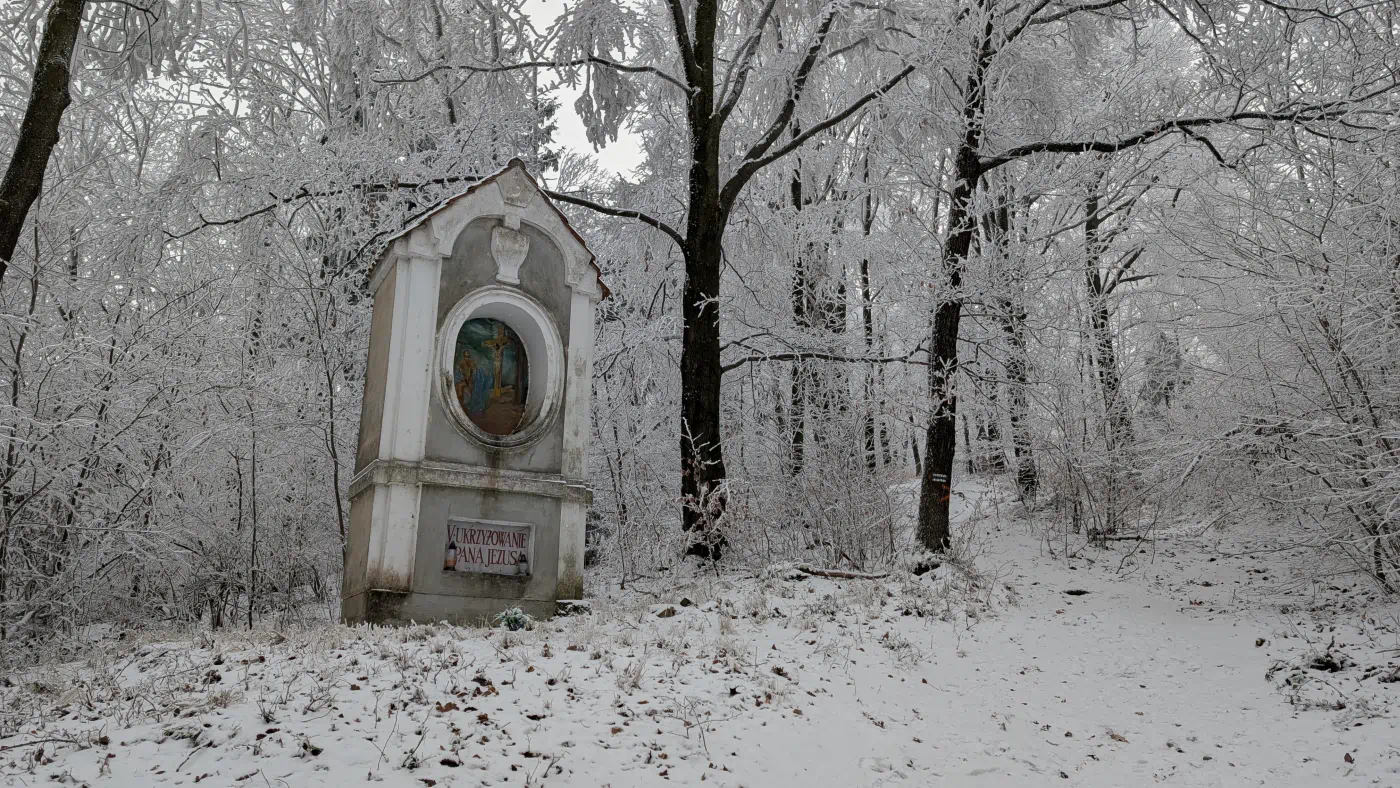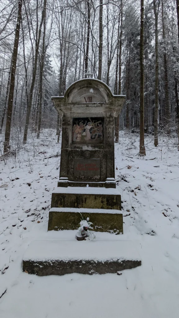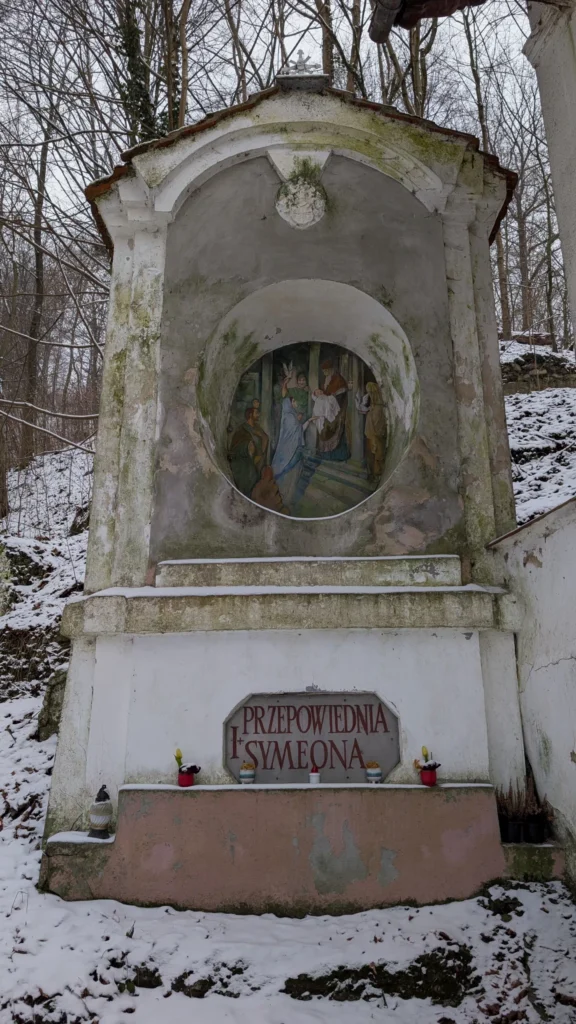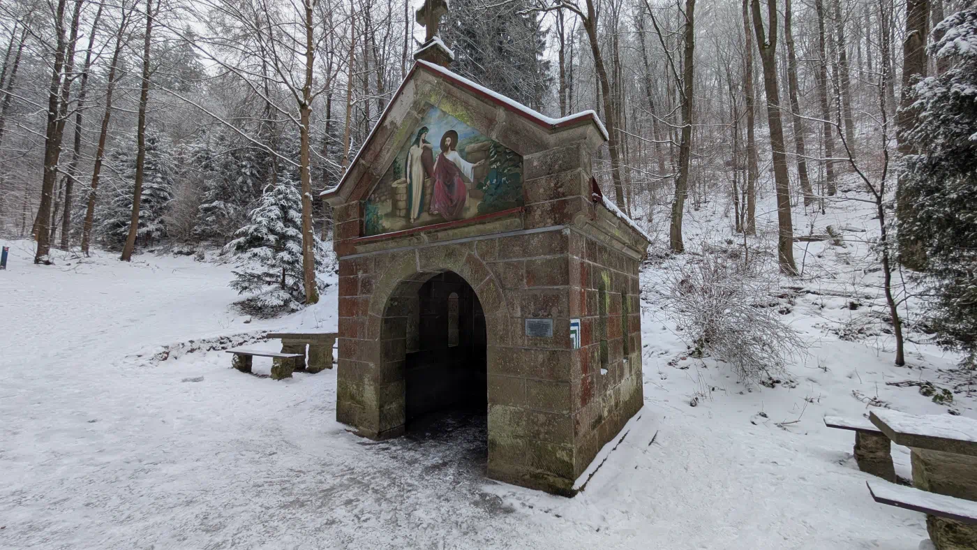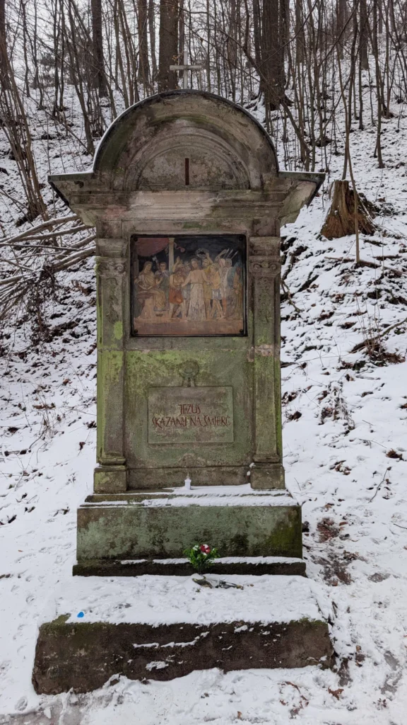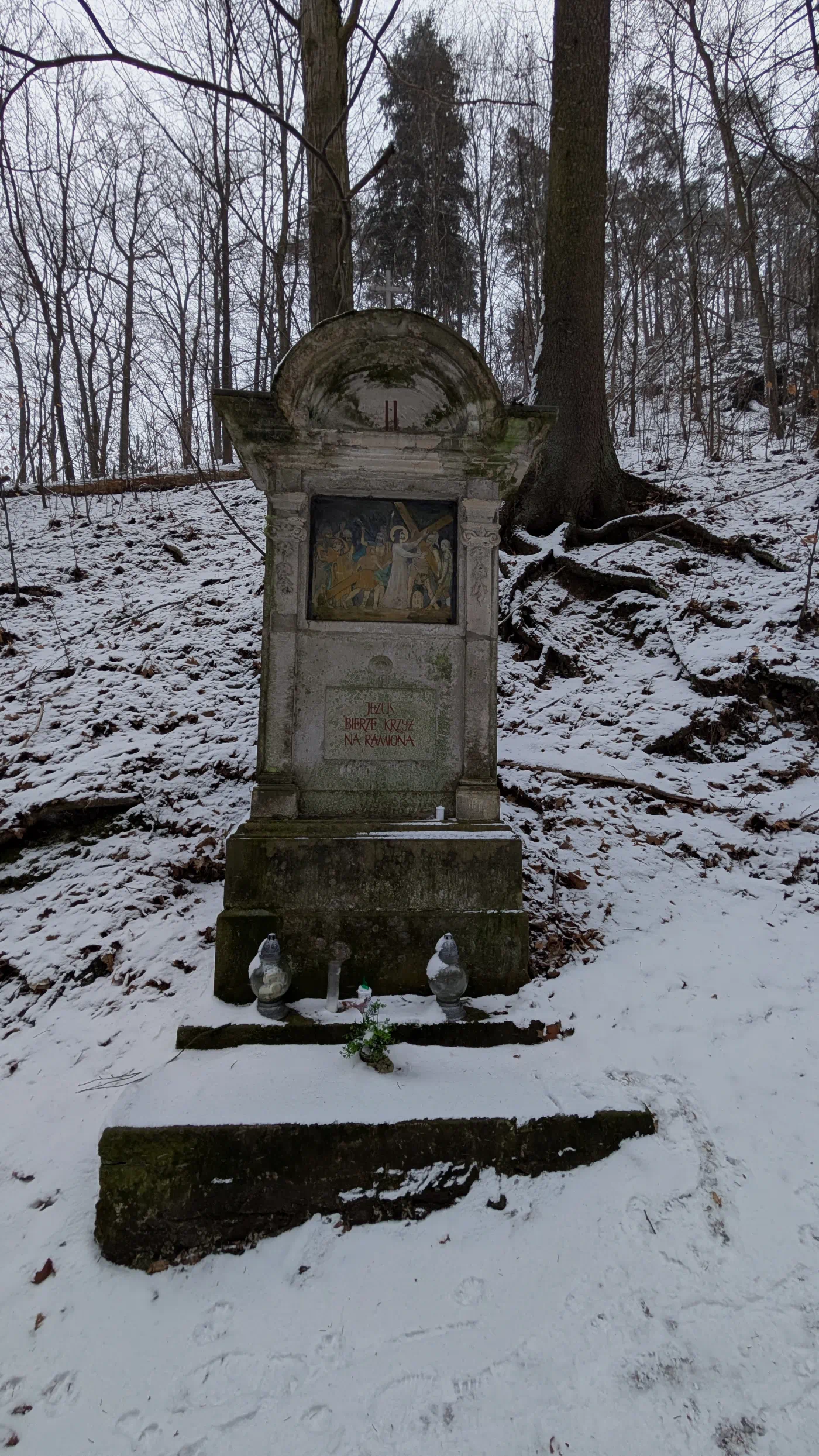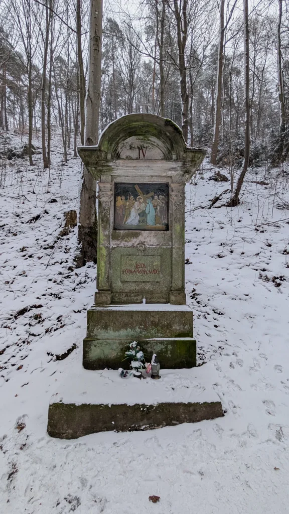 Ruszamy i zaraz za parkingiem skręcamy w prawo kierując się niebieskim szlakiem do góry. Już na początku napotkamy pierwszą klasycystyczną budowlę stacji drogi krzyżowej. Te klasycystyczne stacje stacji Drogi Krzyżowej powstały w latach 1833–1839. Zostały ufundowane i wybudowane przez proboszcza bardańskiego — ks. Franciszka Müllera. Dziś mimo że trochę już zaniedbane stanowią wspaniałe świadectwo historii, religii oraz sztuki naszego regionu.