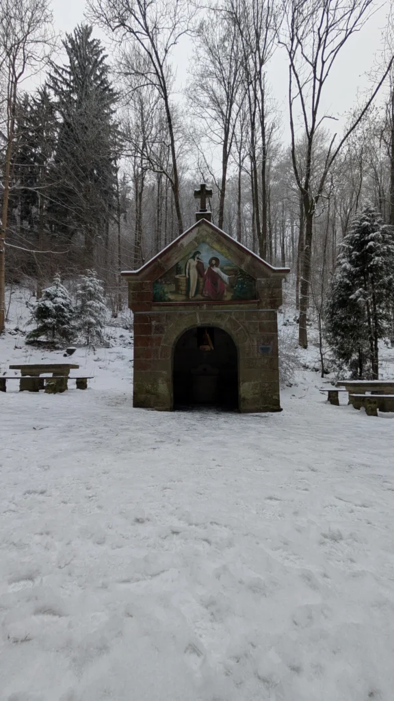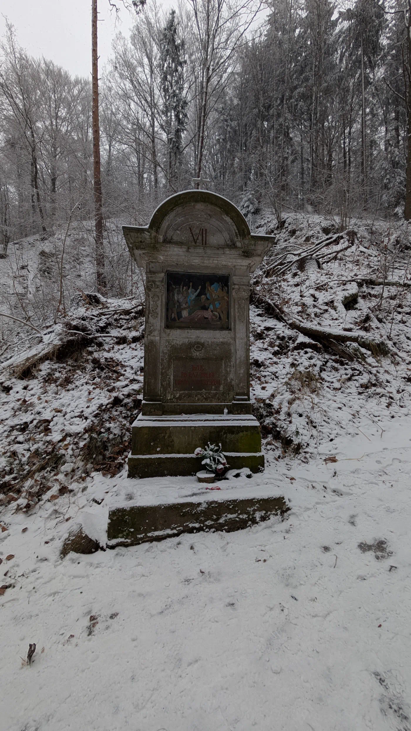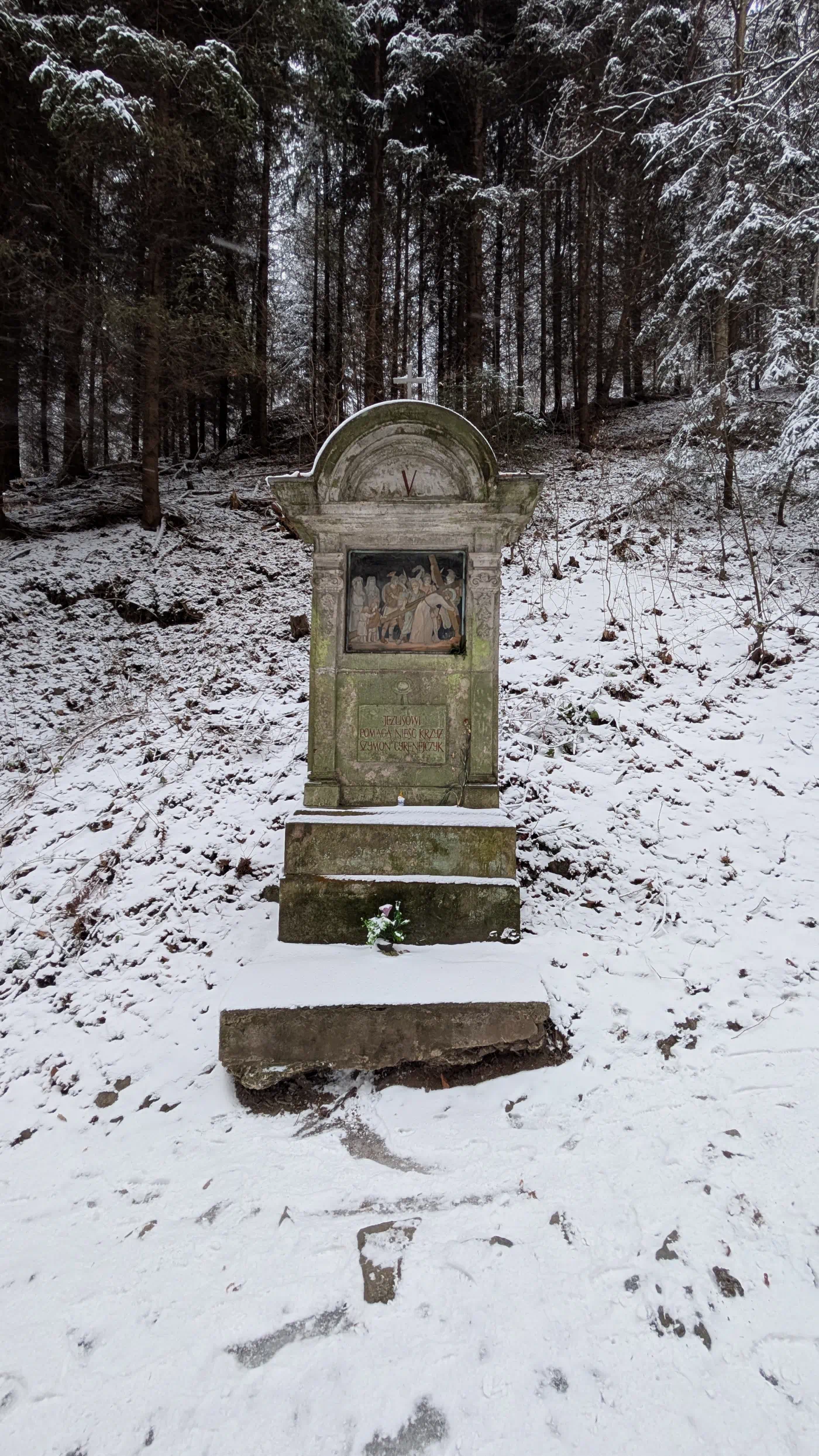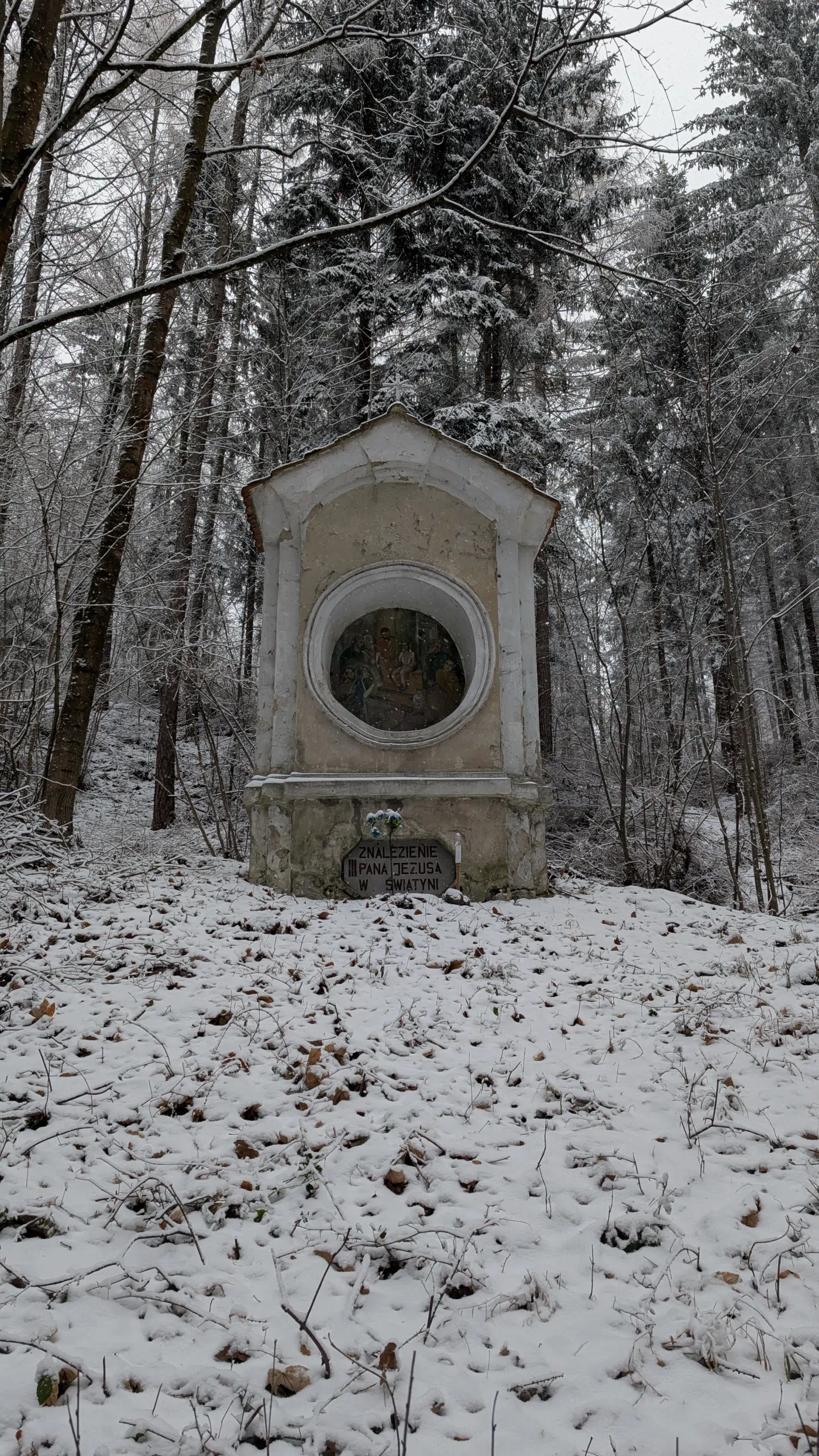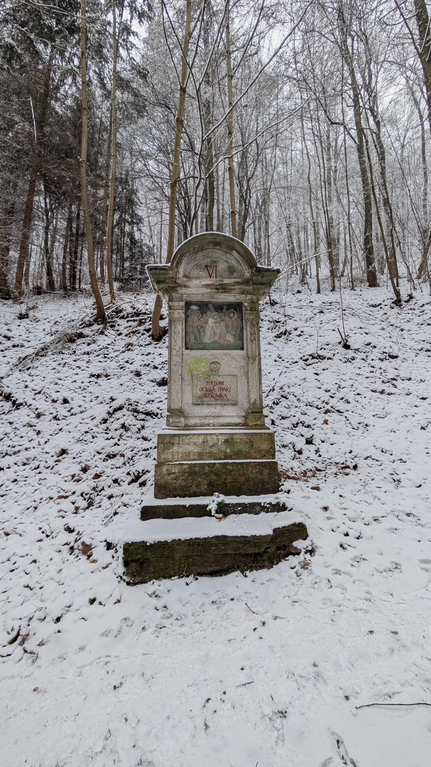 Ruszamy i zaraz za parkingiem skręcamy w prawo kierując się niebieskim szlakiem do góry. Już na początku napotkamy pierwszą klasycystyczną budowlę stacji drogi krzyżowej. Te klasycystyczne stacje stacji Drogi Krzyżowej powstały w latach 1833–1839. Zostały ufundowane i wybudowane przez proboszcza bardańskiego — ks. Franciszka Müllera. Dziś mimo że trochę już zaniedbane stanowią wspaniałe świadectwo historii, religii oraz sztuki naszego regionu.