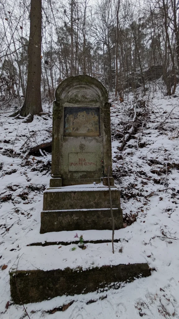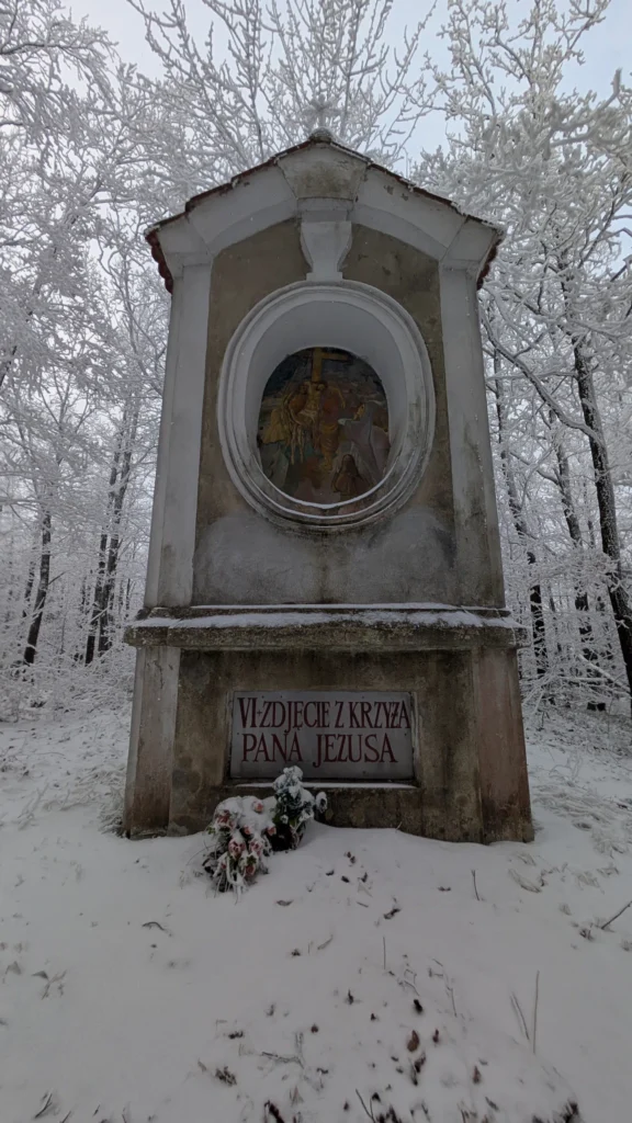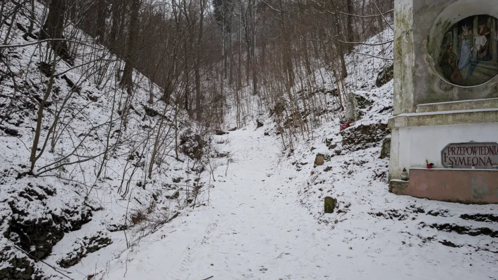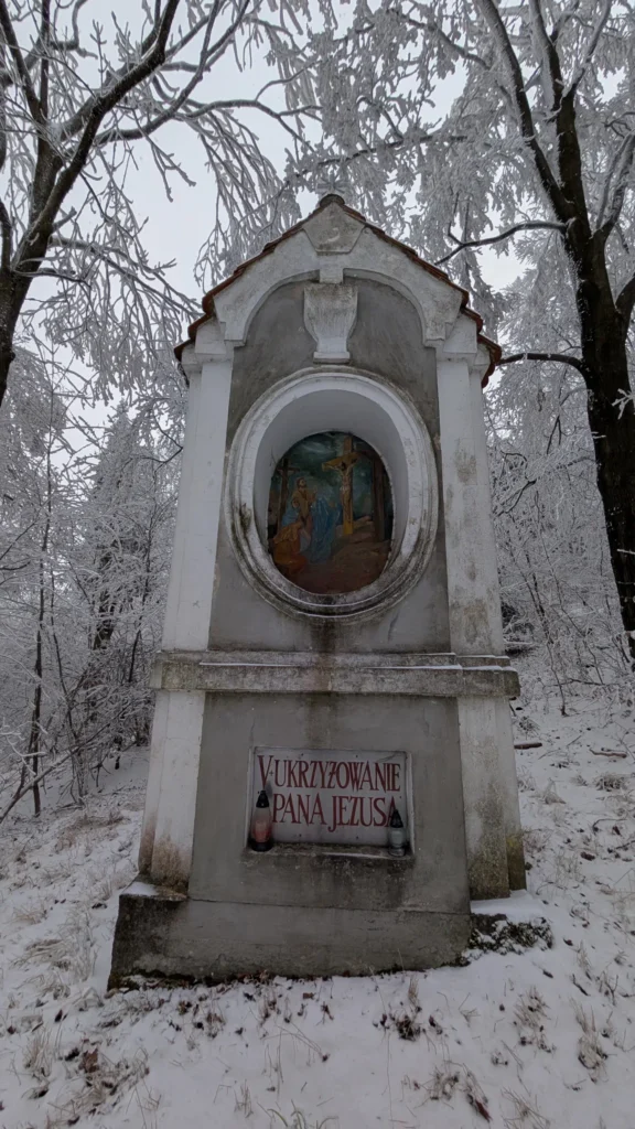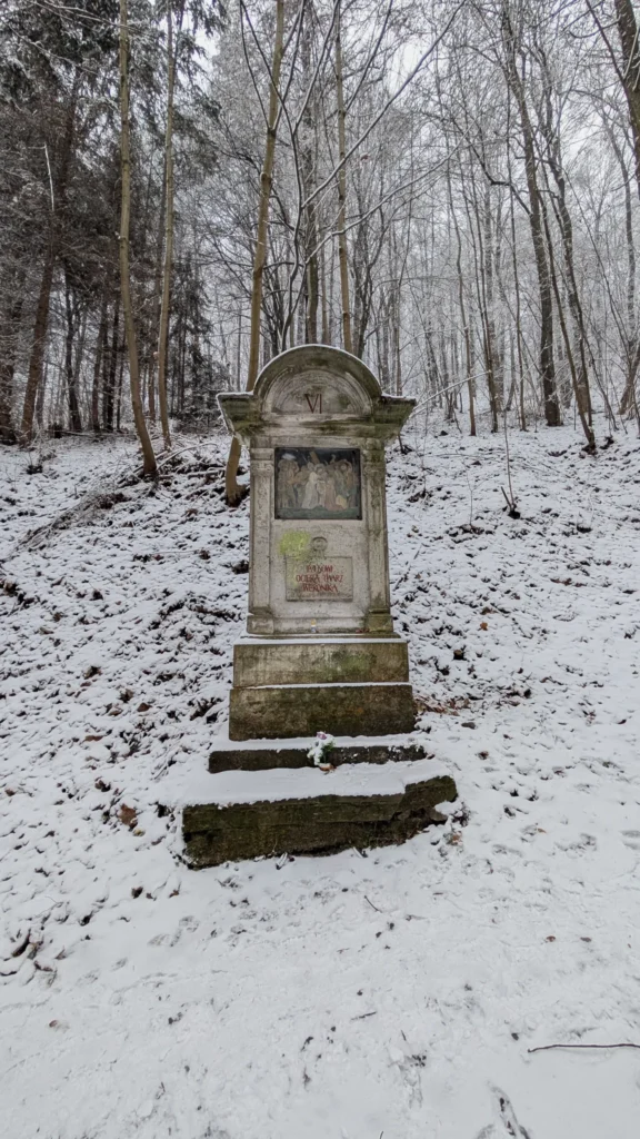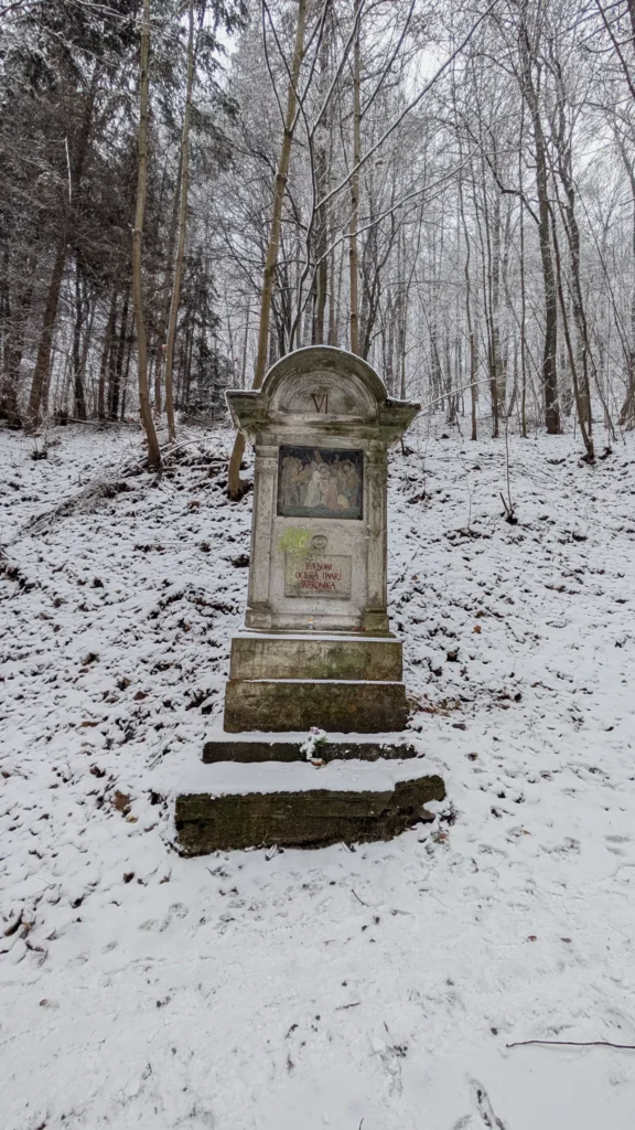 Po krótkim odpoczynku i nasyceniu się widokami ruszamy dalej. W tym miejscu mamy dwie opcje. Pierwsza to powrót do skrzyżowania ze szlakiem niebieskim, z którego zeszliśmy i kontynuowanie trasy szlakiem Drogi Krzyżowej. Dzięki tej opcji będziemy mogli podziwiać całą Drogę Krzyżową.