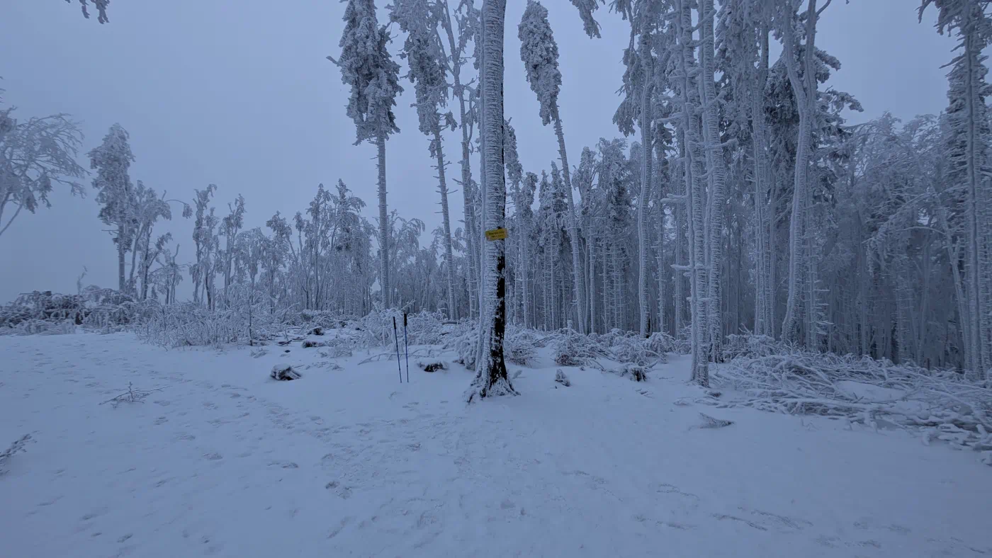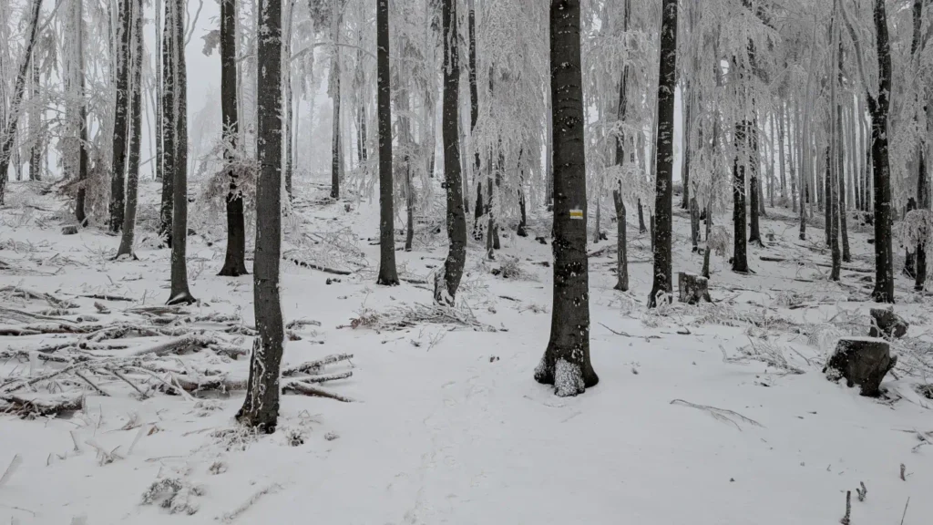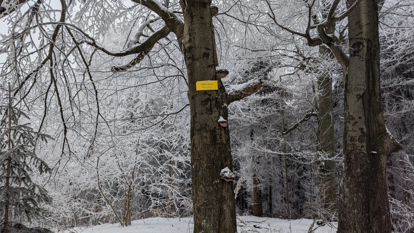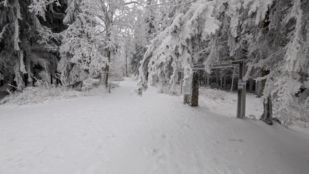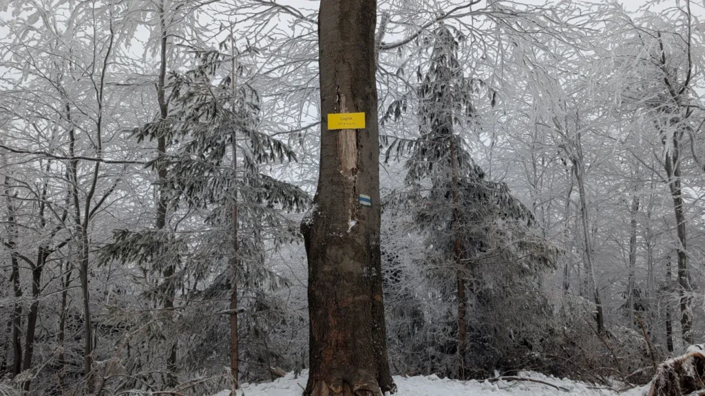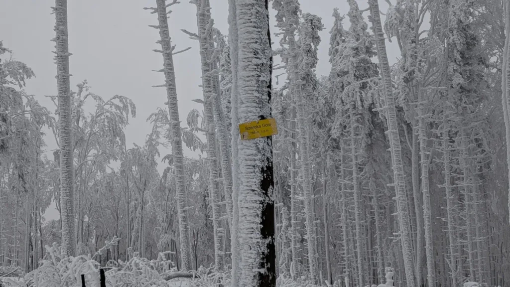Po krótkiej przerwie i obowiązkowym wejściu na szczyt oblodzonej wieży ruszamy dalej w kierunku Szerokiej Góry. W tym celu musimy żółtym szlakiem do ostatniego skrzyżowania. To stąd będziemy wędrować dalej. W tym miejscu warto zwrócić uwagę na małą nieścisłość. Na mapach ( mapy.com, mapa-turystyczna.pl ) na Szeroką Górę nie prowadzi żadne szlak. W rzeczywistości jednak przy odrobinie szczęścia dostrzeżemy żółte szlakówki które zaprowadzą nas na sam szczyt Szerokiej góry. Ze skrzyżowania na szczyt mamy zaledwie ok 300m.