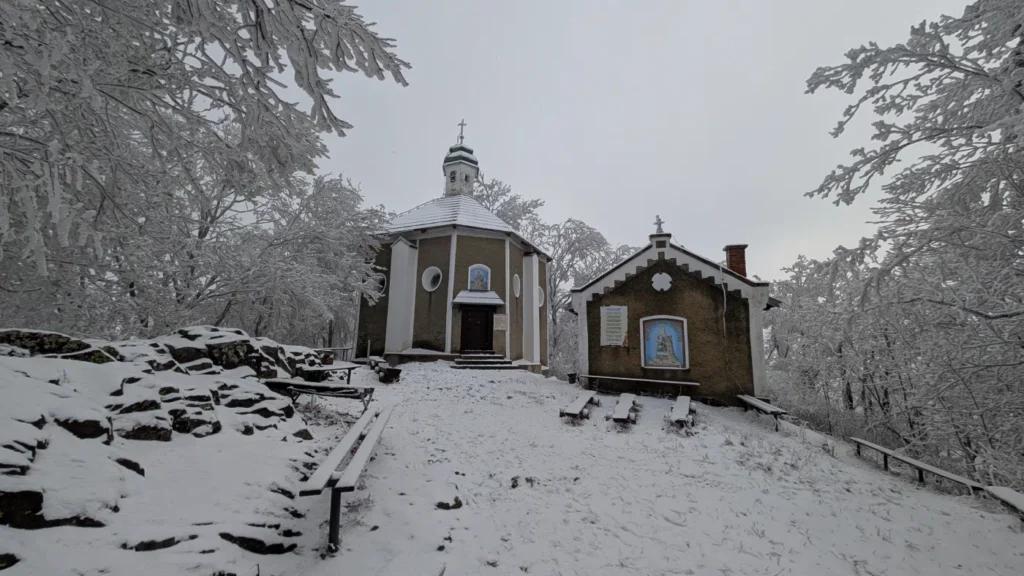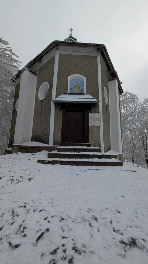 Tutaj zaczyna się już bezpośrednie podejście na Górę Kalwarię. Jeżeli w którymś momencie nie znajdziemy niebieskiej szlakówki to z pewnością pomocne nam będą oznakowania Drogi Krzyżowej. Wspinamy się przez około 500 m aby dotrzeć do zlokalizowanej na szczycie Góry Kalwarii Kapliczki NMP.