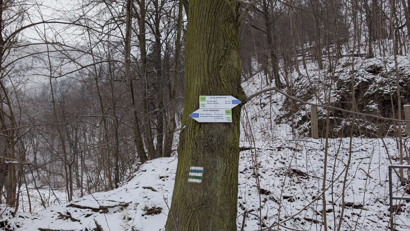 Druga opcja to kontynuacja trasy szlakiem zielonym przez ok 400 m i dojście do łącznika ze szlakiem niebieskim. My wybieramy opcję drugą i na łączniku skręcamy w prawo, aby po kilkuset metrach znaleźć się ponownie na szlaku niebieskim. Pominięty odcinek Drogi Krzyżowej zobaczymy w drodze powrotnej.