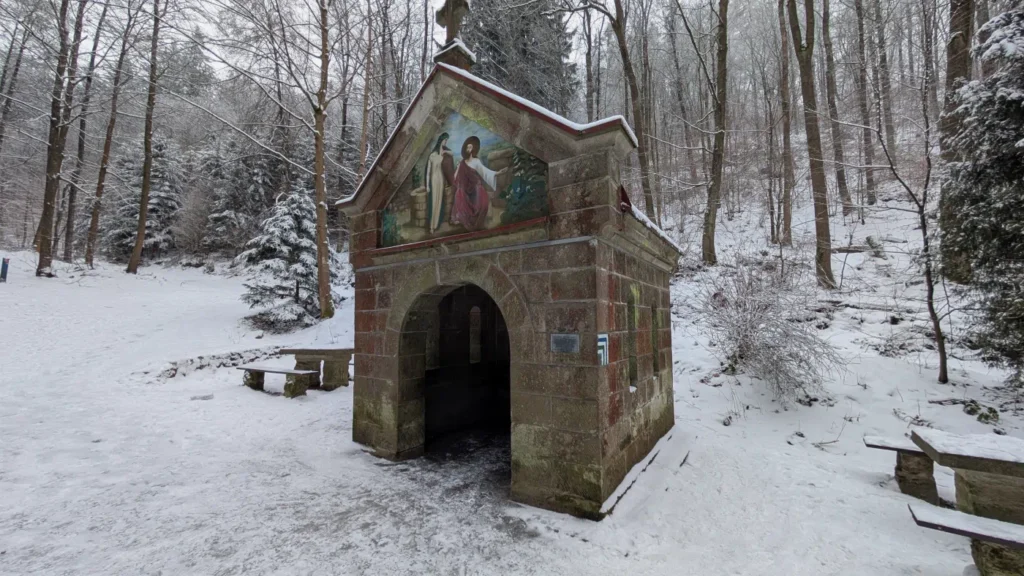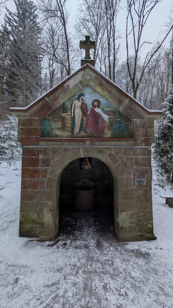 Podążając dalej co kilkadziesiąt metrów będziemy mieli okazję podziwiać jeszcze wiele obiektów sakralnych stanowiących kolejne stacje drogi krzyżowej. Po ok. kilometrze marszu docieramy do Kapliczki Źródło Maryi.